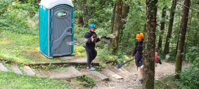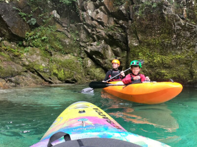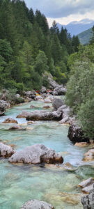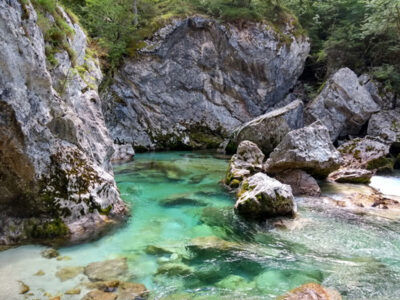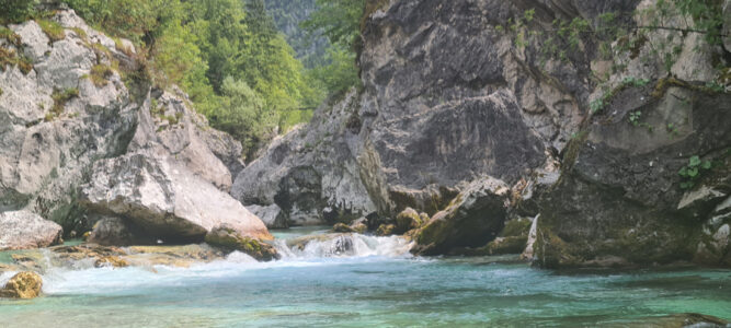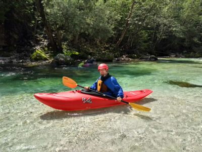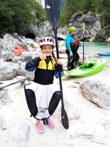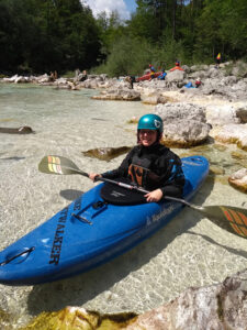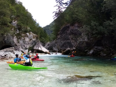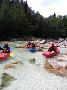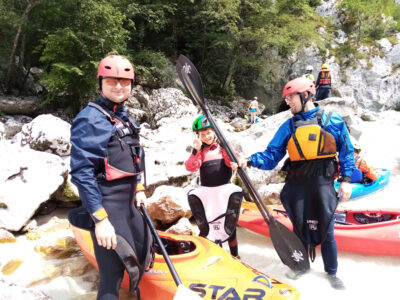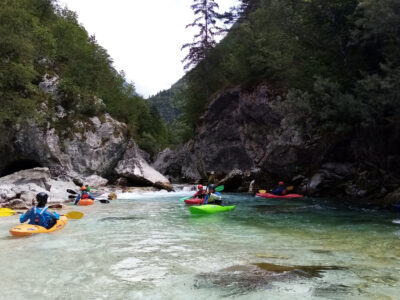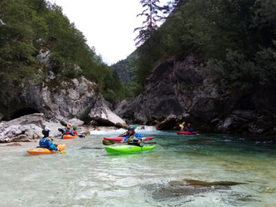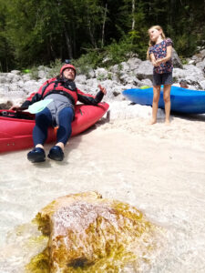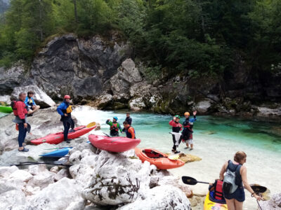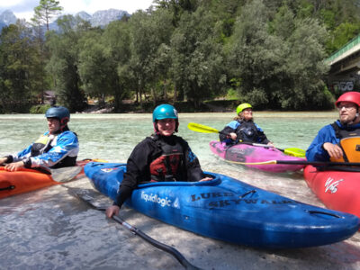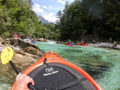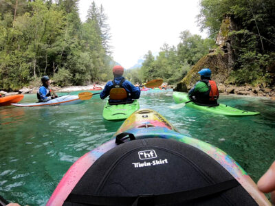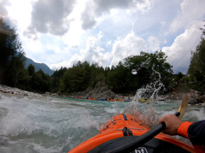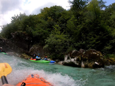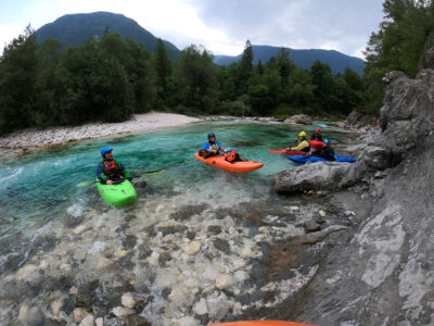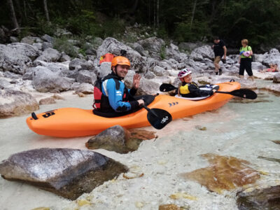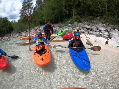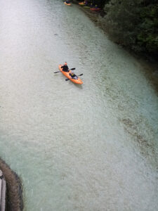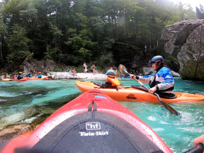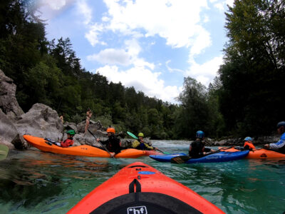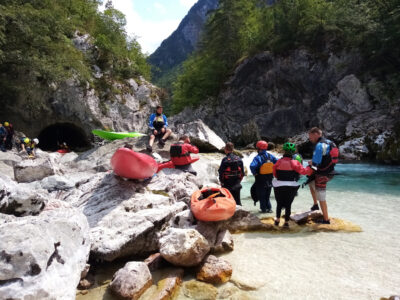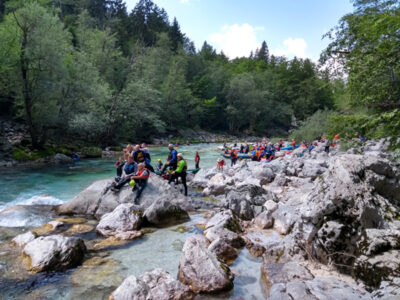 Befahren wurde hauptsächlich die „Hausstrecke“ nach der 3. Klamm bis zum Campingplatz an der Mündung der Koritnica, durchweg leichteres WW 2. Und ab hier dann weiter bis zur Ausstiegsstelle an der Brücke von Cesoča. Mit von der Partie waren auch immer die Kids im Doppelboot, so dass es auch für die jüngsten Teilnehmer spannend wurde. Leider war Ende Juli der Wasserstand erwartungsgemäß recht niedrig, so dass die Befahrung der Koritnica leider entfallen musste. Zum Schwimmen hat es trotzdem gereicht: Es guckten viele Steine raus, mit denen so mancher unfreiwillig nähere Freundschaft geschlossen hat.